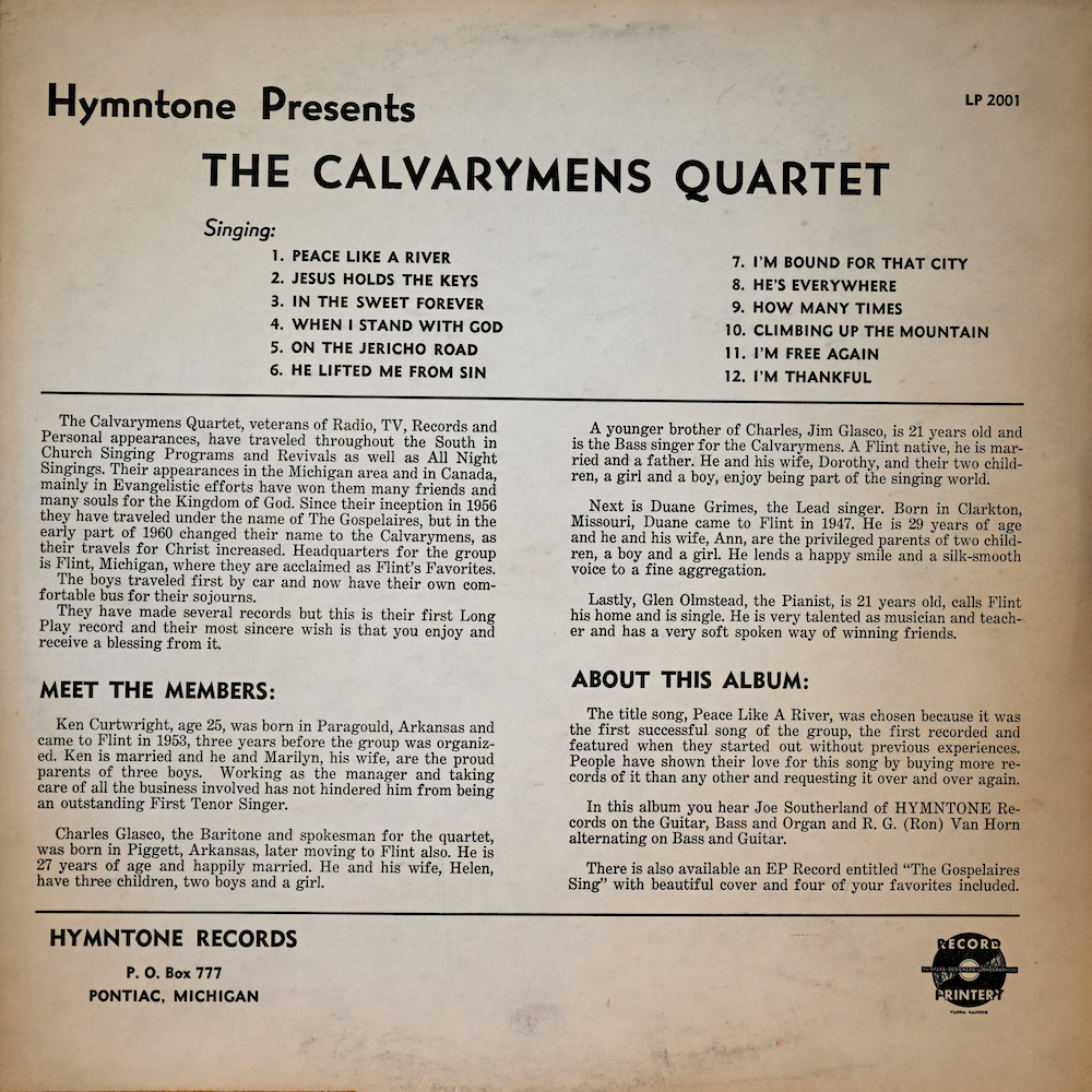 Since their inception in 1956 they have traveled under the name of The Gospelaires, but in the early part of 1960 changed their name to the Calvarymens Quartet. For 27 years, the Calvarymen represented Michigan on the main stage at the National Quartet Convention.
