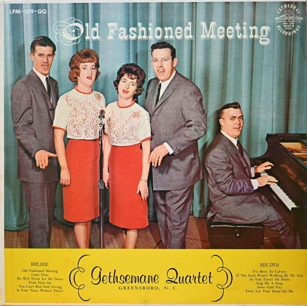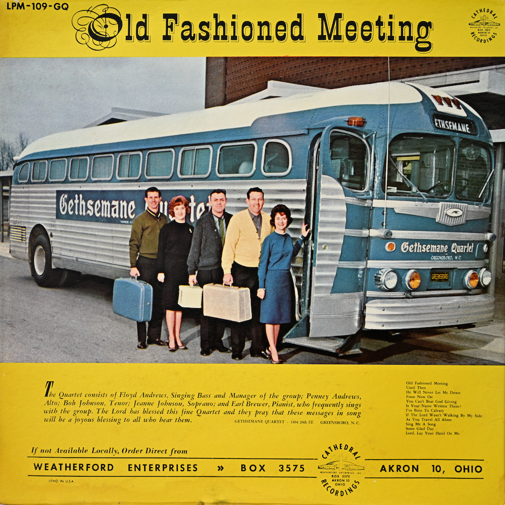 1963 Old Fashioned Meeting (Cathedral Records/LPM-109-GQ): Old Fashioned Meeting; Until Then; He Will Never Let Me Down; From Now On; You Can't Beat God Giving; Is Your Name Written There; I've Been To Calvary; If The Lord Wasn't Walking By My Side; When You Travel All Alone; Sing Me A Song About Jesus; Some Glad Day; Lord, Lay Your Hand On Me (Bob Johnson, Penny Andrews, Jeanne Johnson, Floyd Andrews, Earl Brewer). hi-res