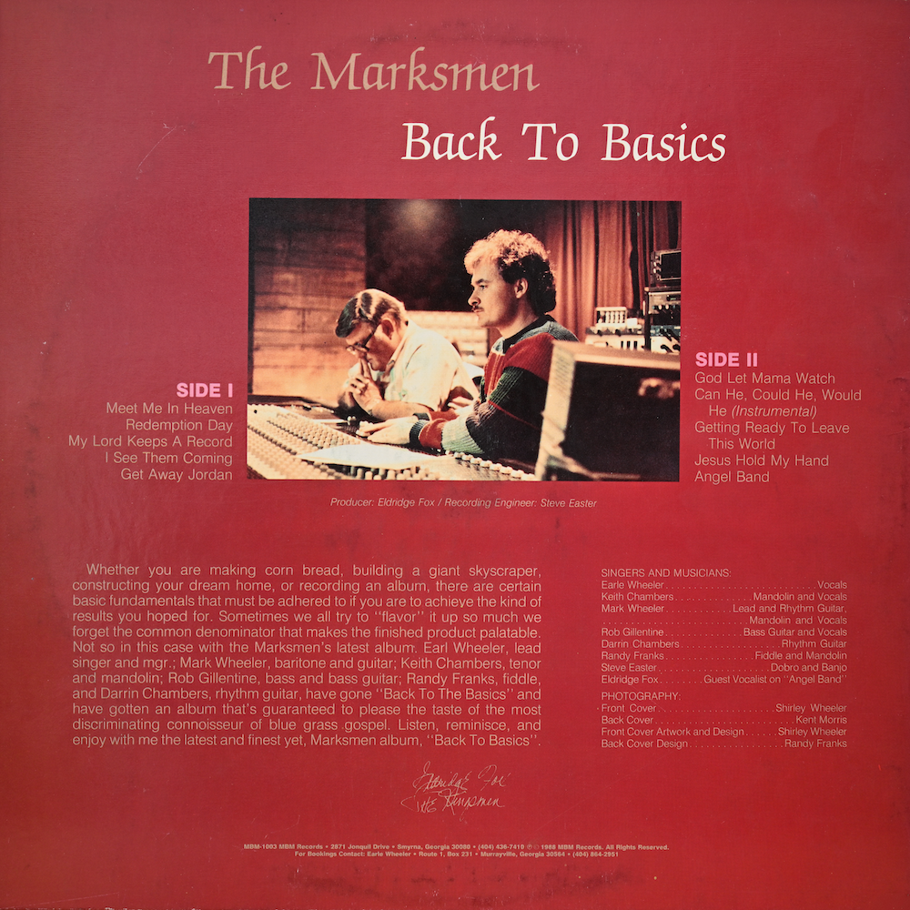 1988 Back To Basics (MBM Records/MBM-1003): Meet Me In Heaven; Redemption Day; My Lord Keeps A Record; I See Them Coming?; Get Away Jordan; God Let Mama Watch?; Can He, Could He, Would He (Instrumental); Getting Ready To Leave This Word?; Jesus Hold My Hand; Angel Band (Guest Vocalist, Eldridge Fox) (Keith Chambers, Earle Wheeler, Mark Wheeler, Rob Gillentine).