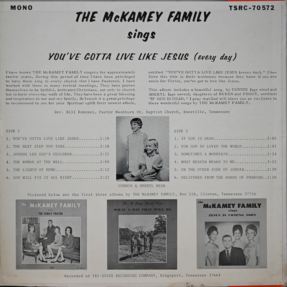 hi-res1970 You've Gotta Live Like Jesus (Every Day) (Tri-State Recording Company/TSRC-70572): You've Gotta Live Like Jesus (Every Day); The Next Step You Take; Joshua Led God's Children; The Woman At The Well; The Lights Of Home; God Will Fix It All Right; If God Is Dead; For God So Loved The World; Sometimes A Mountain; What Heaven Means To Me; On The Other Side Of Jordan; Delivered From The Hands of Pharoah (Peg, Dora, Carol and Ruben) (Connie and Sheryl, age 7 & 9, are featured on "If God Is Dead").
