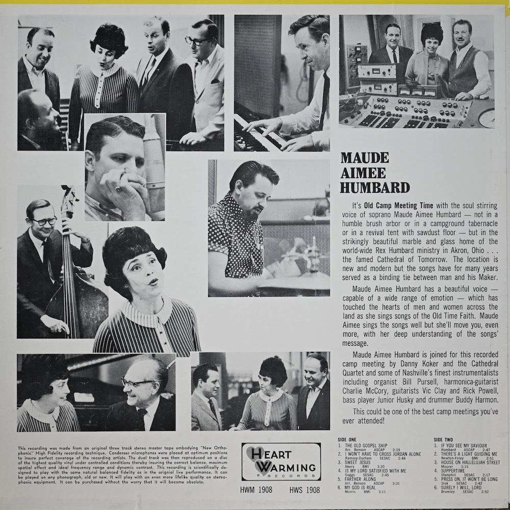hi-res1966 Old Camp Meeting Time (Heart Warming Records/HWM/HWS 1908): The Old Gospel Ship; I Won't Have To Cross Jordan Alone; Sweet Jesus; Is My Lord Satisfied With Me; Farther Along; My God Is Real; If You See My Savior; There's A Light Guiding Me; House On Hallelujah Street; Suppertime; Press On, It Won't Be Long; Surely I Will, Lord.