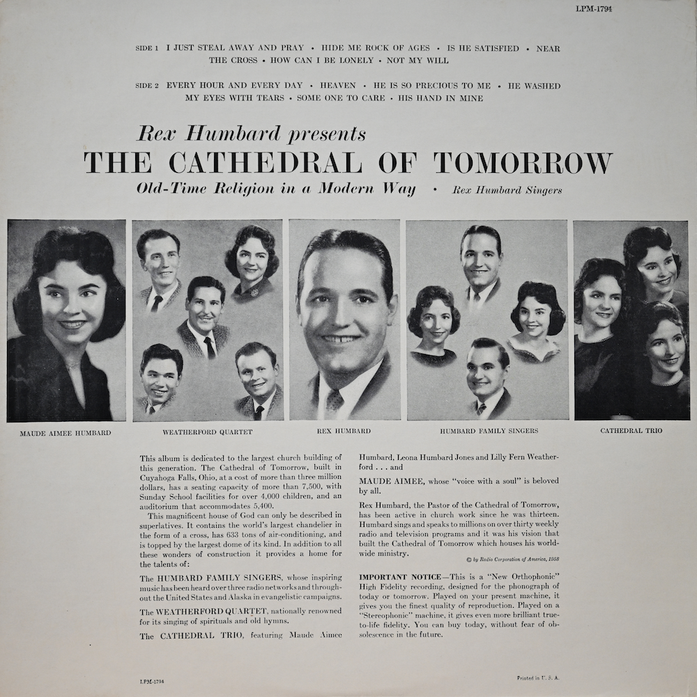 hi-res1958 Old-Time Religion In A Modern Way (RCA Victor/LPM-1794): I Just Steal Away And Pray; Hide Me Rock Of Ages; Is He Satisfied; Near The Cross; How Can I Be Lonely; Not My Will; Every Hour And Every Day; Heaven; He Is So Precious To Me; He Washed My Eyes With Tears; Some One To Care; His Hand In Mine (Humbard Family Singers, The Weatherford Quartet, The Cathedral Trio, Maude Aimee Humbard, Rex Humbard).