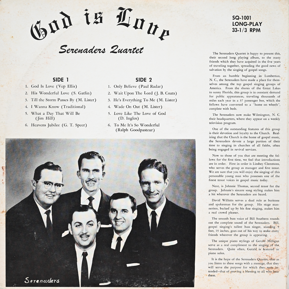 1961 God Is Love (Custom Records/SQ-1001): God Is Love; His Wonderful Love; Till The Storm Passes By; I Wanna Know; What A Day That Will Be; Heavens Jubilee; Only Believe; Wait Upon The Lord; He's Everything To Me; Wade On Out; Love Like The Love Of God; To Me It's So Wonderful (Lindsey Clemmons, Johnnie Thomas, David Willetts, Bill Southern, Gerald Milligan).