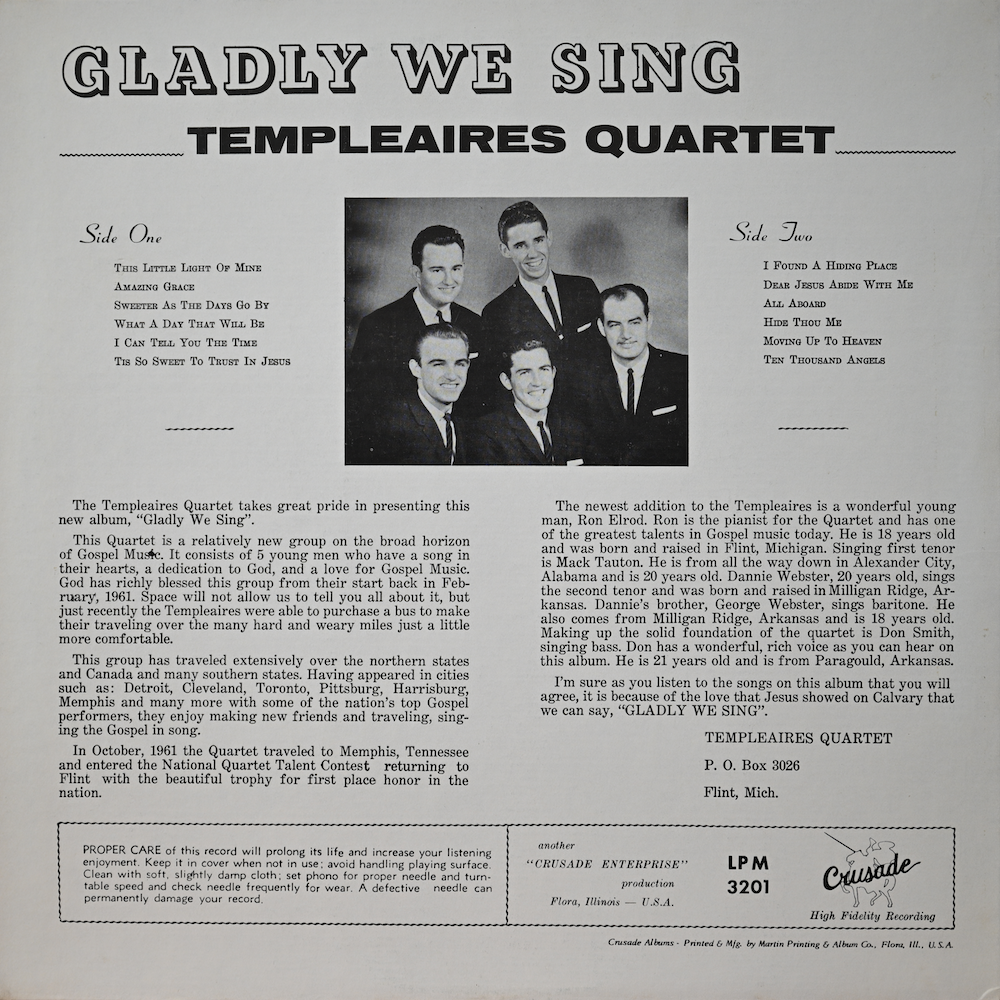 The Templeaires Quartet were based in Flint, Michigan. Group members Mack Taunton and George Amon Webster later became members of the Cathedral Quartet.