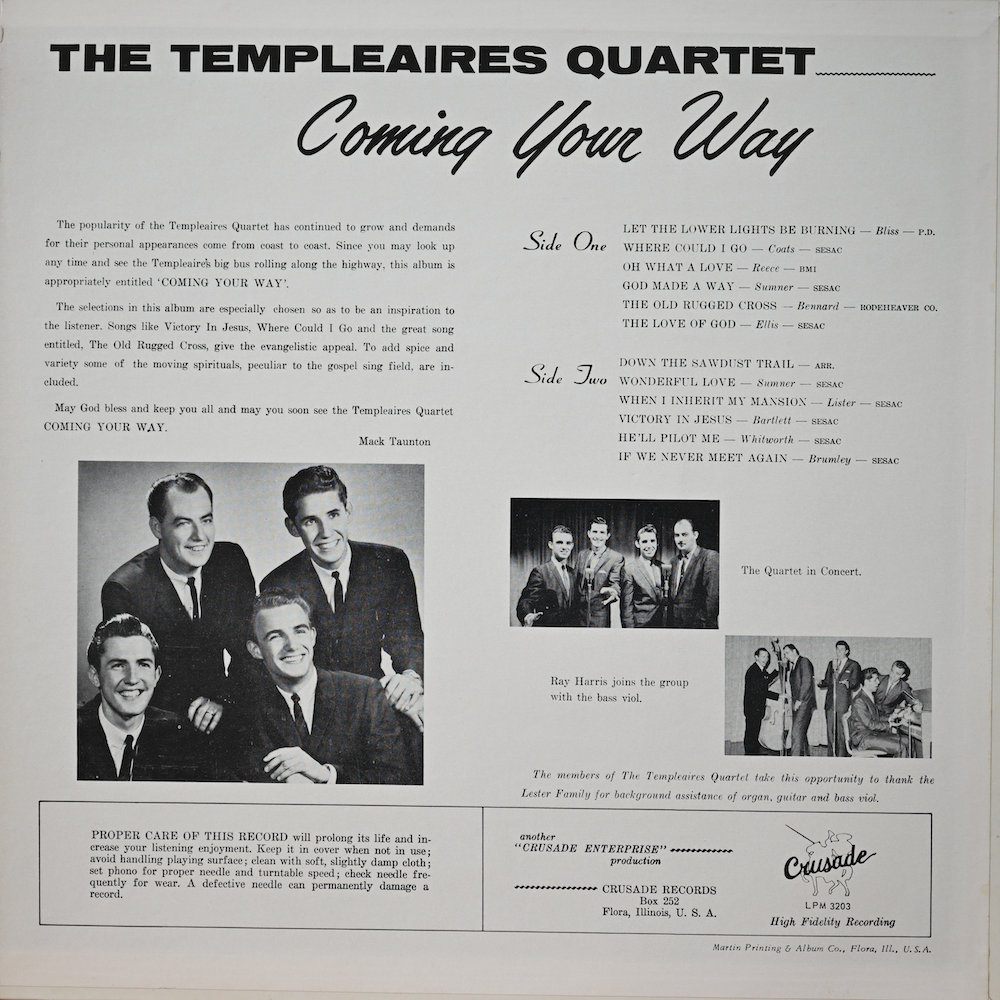 1965 Coming Your Way (Crusade Records/LPM 3203): Let The Lower Lights Be Burning; Where Could I Go; Oh What A Love; God Made A Way; The Old Rugged Cross; The Love Of God; Down The Sawdust Trail; Wonderful Love; When I Inherit My Mansion; Victory In Jesus; He'll Pilot Me; If We Never Meet Again (Mack Taunton, Dannie Webster, George Amon Webster, Don Smith).