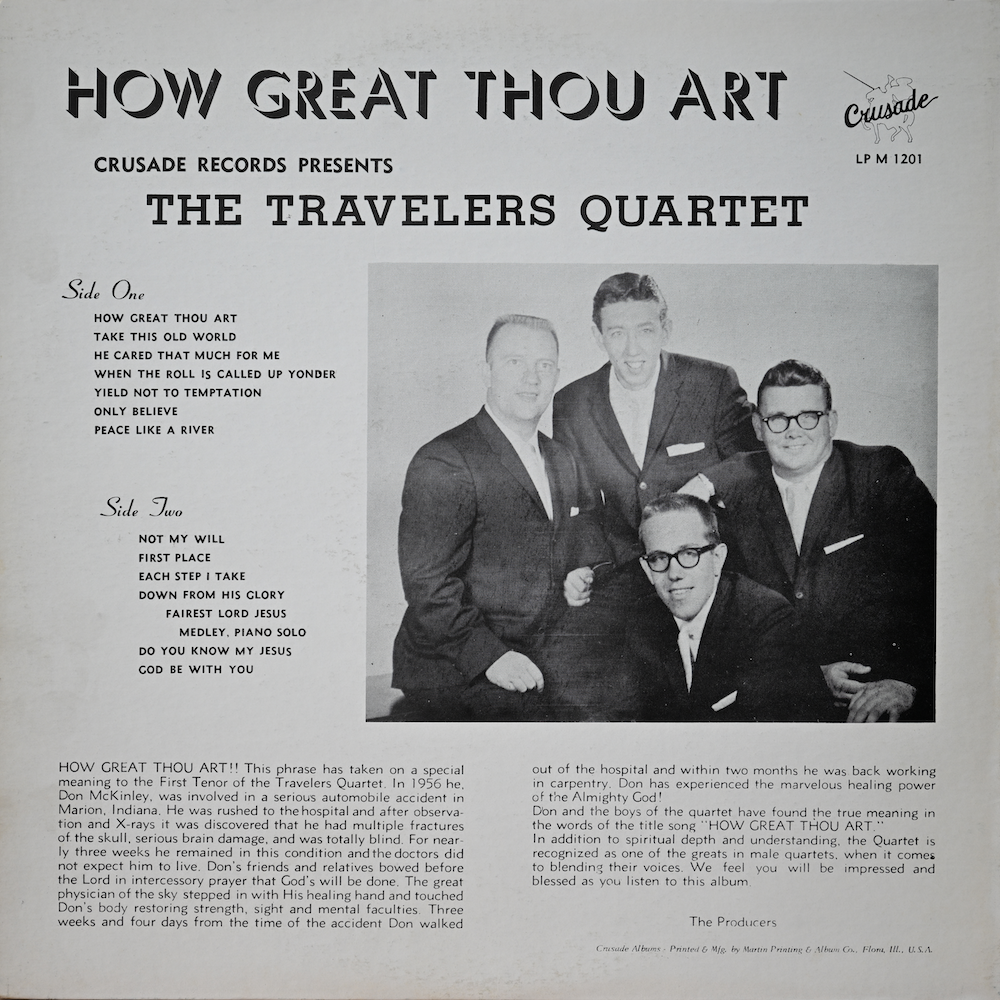 hi-res1961 How Great Thou Art (Crusade Records/LPM-1201): How Great Thou Art; Take This Whole World; He Cared That Much For Me; When The Roll Is Called Up Yonder; Yield Not To Temptation; Only Believe; Peace Like A River; Not My Will; First Place; Each Step I Take; Down From His Glory/Fairest Lord Jesus/Medley, Piano Solo; Do You Know My Jesus; God Be With You (Don McKinley, Winston Stephens, Jim Talbott, Earl Newton).