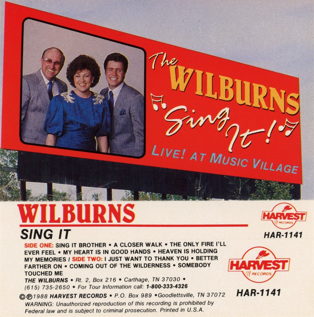 1988 Sing It! Live! At Music Village (Harvest Records/HAR-1141): Sing It Brother; A Closer Walk; The Only Fire I'll Ever Feel; My Heart Is In Good Hands; Heaven Is Holding My Memories; I Just Want To Thank You; Better Farther On; Coming Out Of The Wilderness; Somebody Touched Me (Jackie Wilburn, Elaine Wilburn, Jonathan Wilburn).