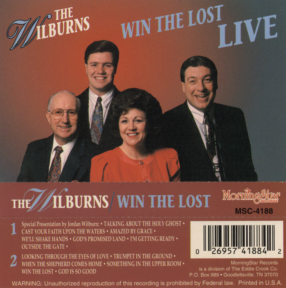 hi-res1994 Win The Lost - Live (Morningstar Records/MS-4188): Special Presentation by Jordan Wilburn; Talking About The Holy Ghost; Cast Your Faith Upon The Waters; Amazed By Grace; We'll Shake Hands; God's Promised Land; I'm Getting Ready; Outside The Gate; Looking Through The Eyes Of Love; Trumpet In The Ground; When The Shepherd Comes Home; Something In The Upper Room; Win The Lost; God Is So Good (Jackie Wilburn, Elaine Wilburn, Jonathan Wilburn, Tony Peace).