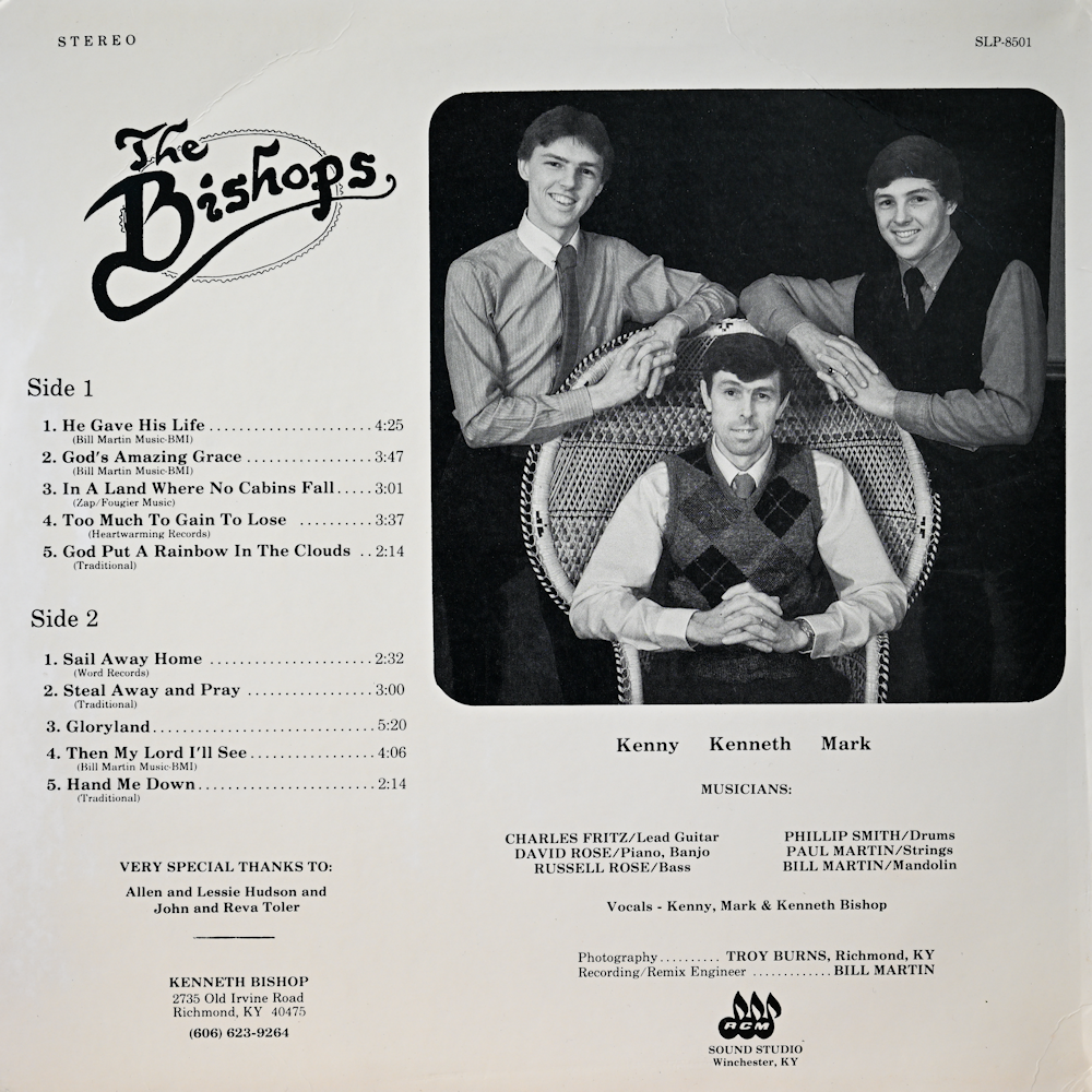 1984 He Gave His Life (RCM Records/SLP-8501/CT8406): He Gave His Life; God’s Amazing Grace; In A Land Where No Cabins Fall; Too Much To Gain To Lose; God Put A Rainbow In The Clouds; Sail Away Home; Steal Away And Pray; Gloryland; Then My Lord I’ll See; Hand Me Down (Kenny Bishop, Mark Bishop, Kenneth Bishop). hi-res