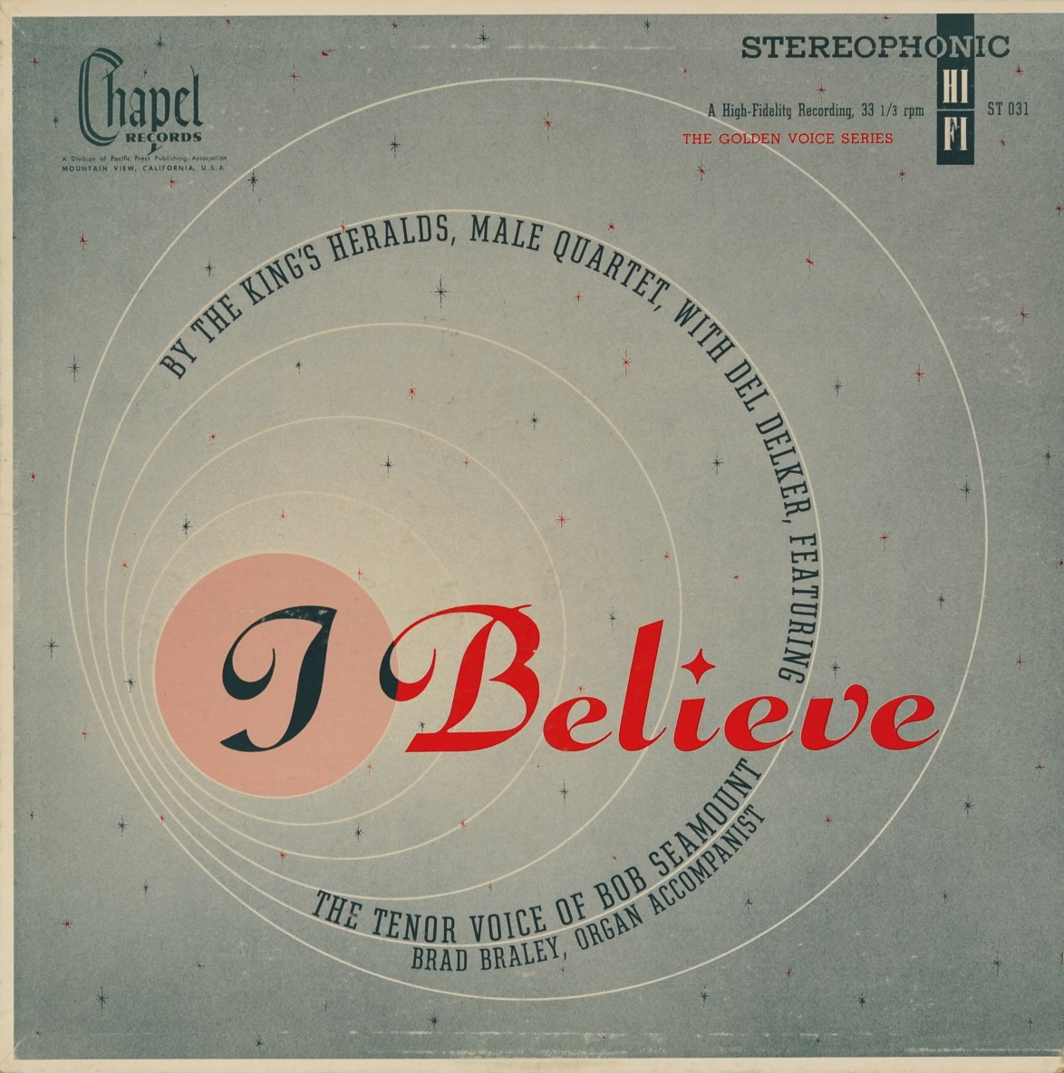1961 I Believe (Chapel Records/LP-5031/ST-031): I Believe; O Lord Most Holy; The Quiet Vale Of Prayer; Back Of The Clouds; Enough For Me; Who At My Door Is Standing; Open My Eyes That I May See; Beautiful City; Go Tell It On The Mountain; Farther Along; He, You Better Mind; Do You Love My Lord; Peace In The Valley; I Know Who Holds Tomorrow (Bob Edwards, Bob Seamount, Wayne Hooper, Jerry Dill, Del Delker, Brad Braley).
