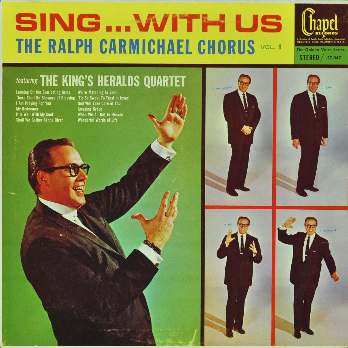 1961 Sing...With Us (Chapel Records/LP-5047/ST-047): Leaning On The Everlasting Arms; There Shall Be Showers Of Blessing; I Am Praying For You; My Redeemer; It Is Well With My Soul; Shall We Gather At The River; We're Marching To Zion; Tis So Sweet To Trust In Jesus; God Will Take Care Of You; Amazing Grace; When We All Get To Heaven Wonderful Words Of Life (The Ralph Carmichael Chorus Vol. 1, featuring The King's Heralds Quartet) (Bob Edwards, Bob Seamount, Wayne Hooper, Jerry Dill).