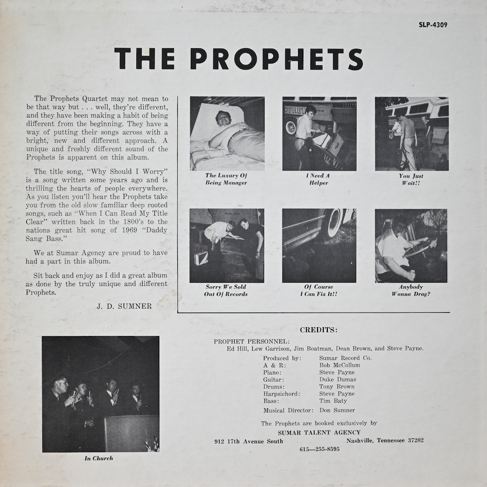Except for a period of one year or so, Ed Hill was the group's manager and baritone for the group's entire initial run of fourteen years. Future Oak Ridge Boys lead singer Duane Allen sang baritone during 1965-1966 when Hill was off the road. "Big Lew" Garrison, always an audience favorite, was a constant member for twelve years and was an integral part of the Prophets' sound. He was replaced by Grady Nix for the group's final two years.