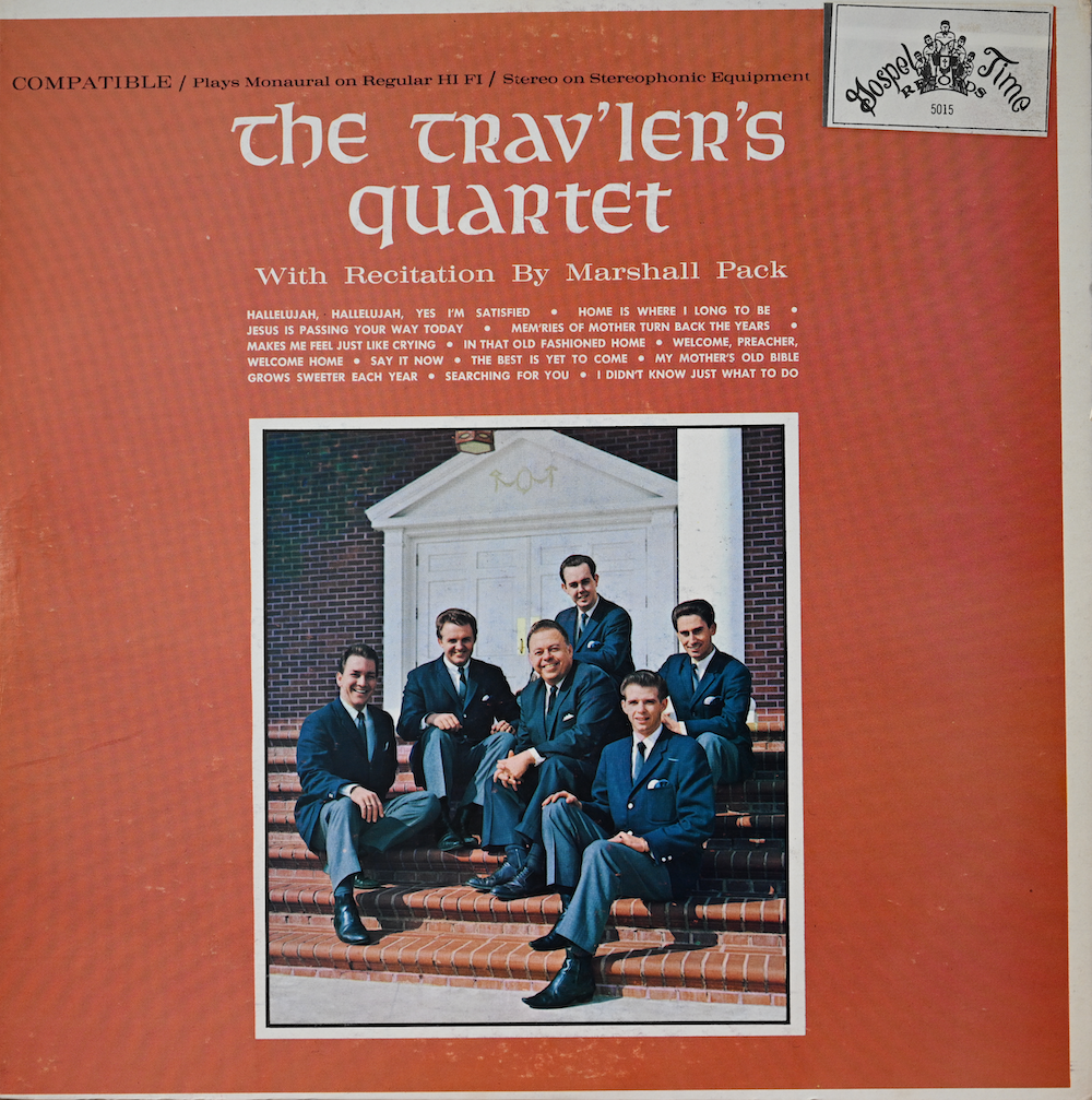 1966 The Trav'lers Quartet With Recitation By Marshall Pack (Songs Of Faith Records/SOF 131): Hallelujah, Hallelujah, Yes I'm Satisfied; Home Is Where I Long To Be; Jesus Is Passing Your Way Today; Mem'ries Of Mother Turn Back The Years; Makes Me Feel Just Like Crying; In That Old Fashioned Home; Welcome, Preacher, Welcome Home; Say It Now; The Best Is Yet To Come; My Mother's Old Bible Grows Sweeter Each Year; Searching For You; I Didn't Know Just What To Do (While the record album cover has a sticker applied with the label Gospel Time Records, the record is actually on Songs Of Faith Records/SOF 131) (Bobby Edwards, Carl Whitman, Tommy Brown, Joel Duncan, Otis Forrest).