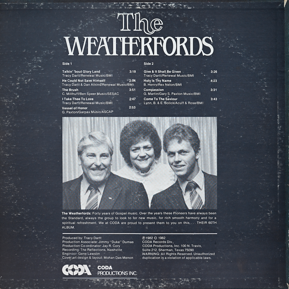 1982 60th Album (Coda Records/2001): Talkin' 'Bout Gloryland; He Could Not Save Himself; The Brush; I Take Thee To Love; Vessel Of Honor; Give And It Shall Be Given; Holy Is Thy Name; Compassion; Come To The Saviour (Released on cassette on (Custom Records/165) in 1987, with the same songs but slightly different order) (Earl Weatherford, Lily Fern Weatherford, Steve Weatherford). hi-res