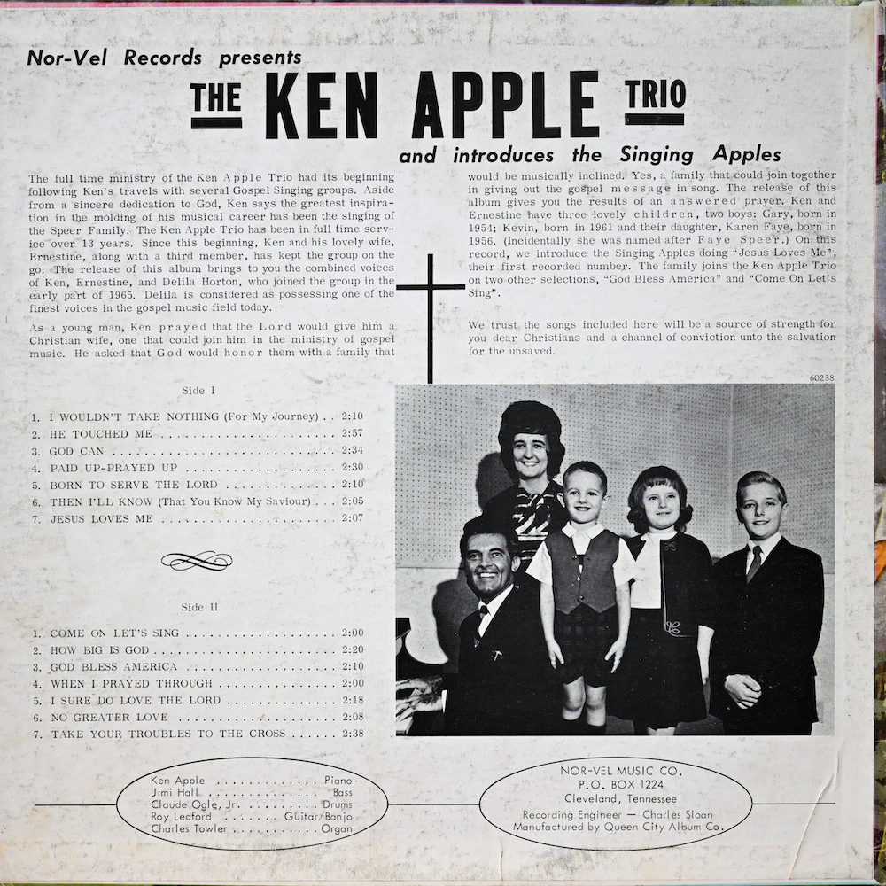 1960s The Singing Apples featuring "Jesus Loves Me" (Custom Records/60238): I Wouldn't Take Nothing (For My Journey); He Touched Me; God Can; Paid Up, Prayed Up; Born To Serve The Lord; Then I'll Know (That You Know My Saviour); Jesus Loves Me; Come On Let's Sing; How Big Is God; God Bless America; When I Prayed Through; I Sure Do Love The Lord; No Greater Love; Take Your Troubles To The Cross (Ken Apple, Ernestine Apple, Delila Horton, Gary Apple, Kevin Apple, Karen Faye Apple).