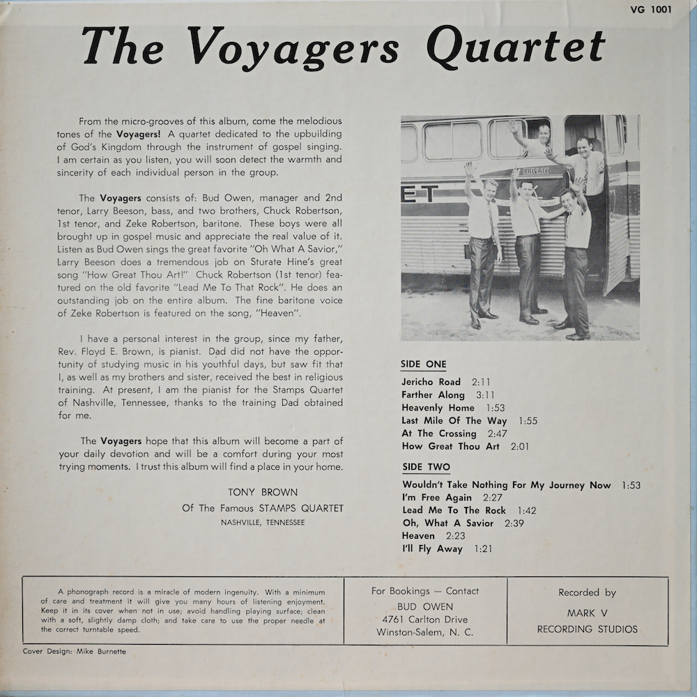 hi-res1966 Here Come The Voyagers Quartet (Custom Records/VQ-1001): Jericho Road; Farther Along; Heavenly Home; Last Mile Of The Way; At The Crossing; How Great Thou Art?; Wouldn't Take Nothing For My Journey Now; I'm Free Again; Lead Me To The Rock; Oh, What A Savior; Heaven; I'll Fly Away (Chuck Robertson, Bud Owen, Zeke Robertson, Larry Beeson, Rev. Floyd E Brown).
