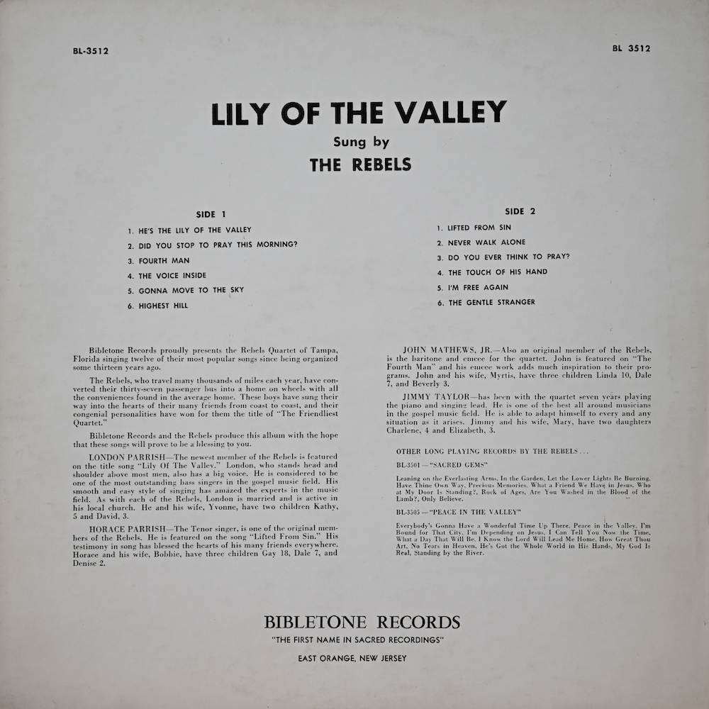 1959 Lily Of The Valley (Bibletone Records/BL-3512): He's The Lily Of The Valley; Did You Stop To Pray This Morning; Fourth Man; The Voice Inside; Gonna Move To The Sky; Highest Hill; Lifted From Sin; Never Walk Alone; Do You Ever Think To Pray; The Touch Of His Hand; I'm Free Again; The Gentle Stranger (Horace Parrish, Jimmy Taylor, John Mathews, London Parris) (Re-issued in 1965 on Canaan Records/CA-4604/CAS-9604).